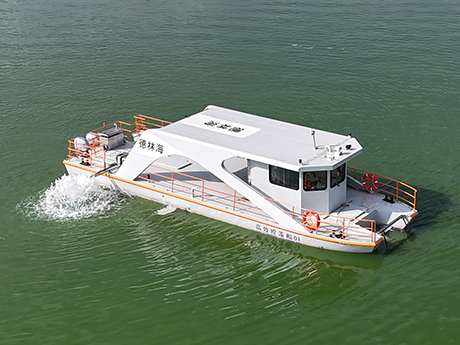 公司研發的加壓控藻船,以玻璃鋼船體為平臺,配置藍藻打撈、壓力控藻和曝氣裝置...